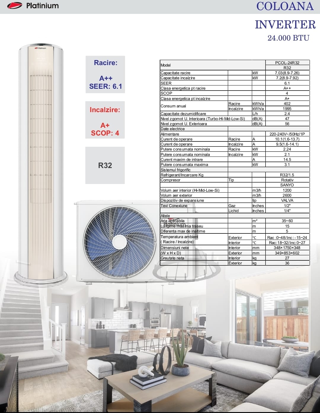 Aer Condiționat Tip Coloană Platinium PCOL-24R32, Inverter 24000 BTU, Clasa A++/A+