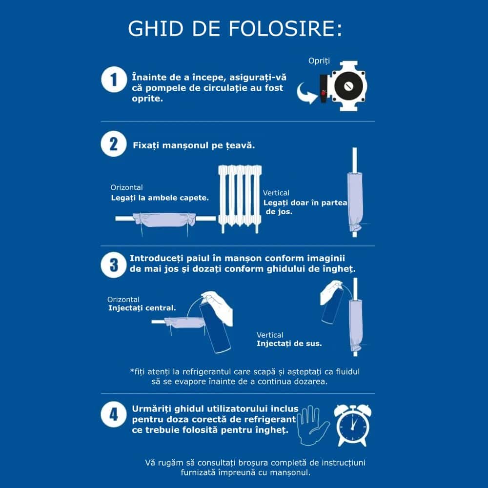 Kitul de congelare poate fi utilizat pentru reparații și instalații de încălzire centrală, pentru instalarea / repararea robinetelor de oprire și a supapelor de serviciu, instalații sanitare în mașini de spălat sau mașini de spălat vase, înlocuirea mașinilor de spălat rezervoare, instalarea unităților de duș și instalarea sau înlocuirea robinetelor sau șaibelor