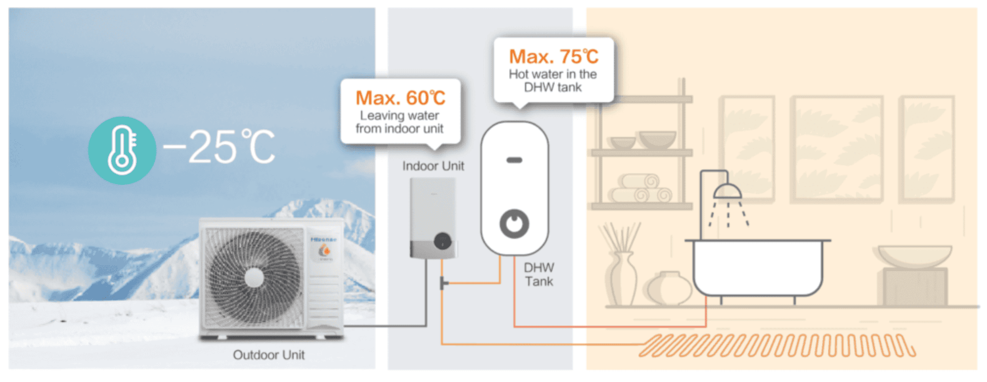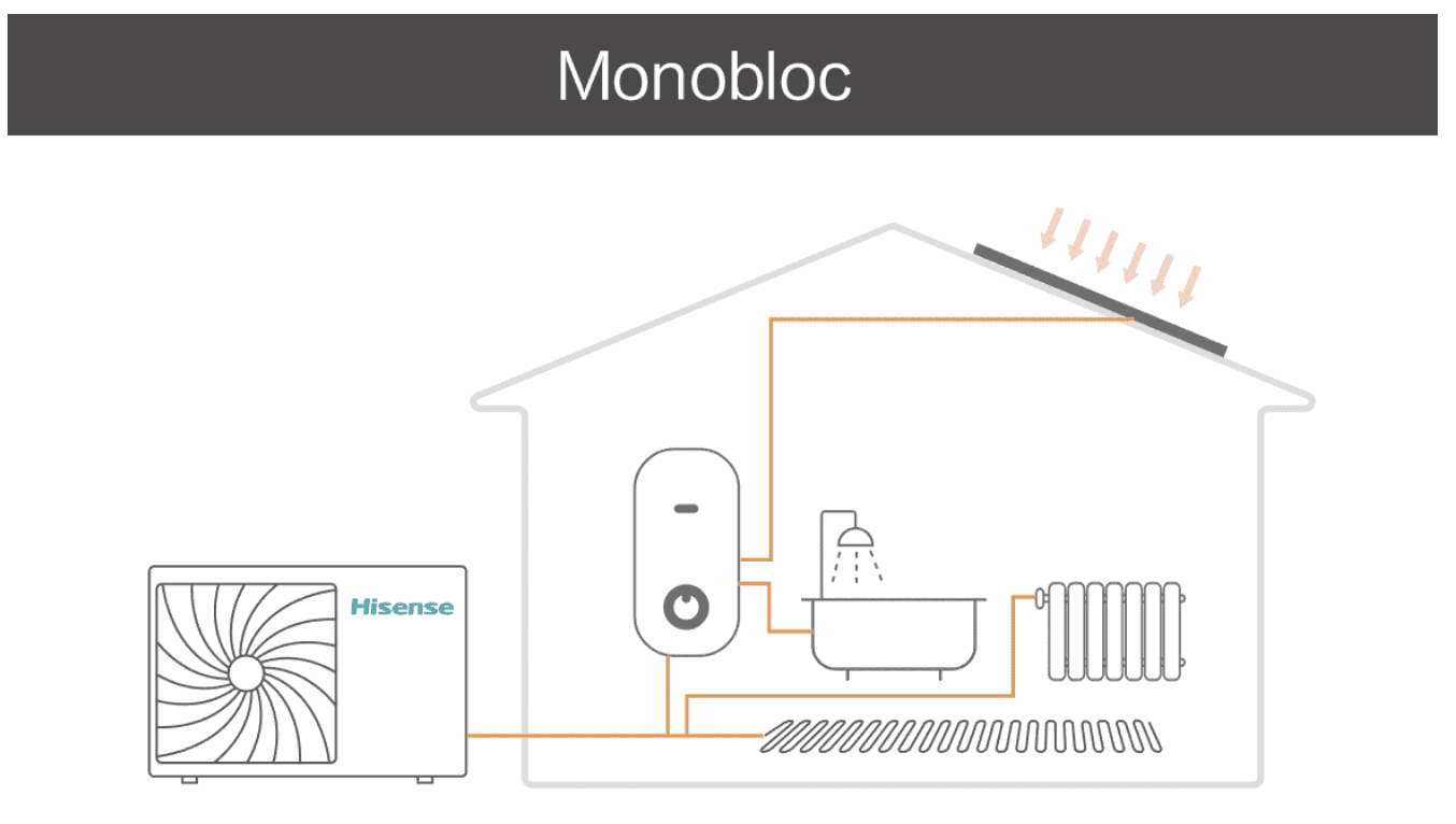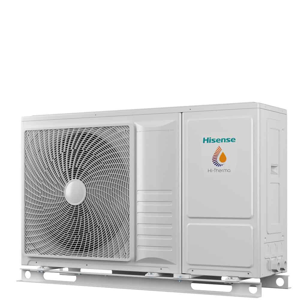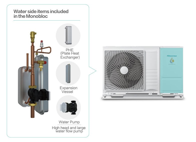 Unitatea HISENSE Hi-Therma Monobloc este un sistem de pompă de căldură aer-apă în care unitatea interioară și cea exterioară sunt combinate într-un singur modul, ceea ce permite realizarea tuturor funcțiilor cu o singură unitate exterioară. Nu este necesară instalarea conductelor de agent frigorific, deoarece unitatea Monobloc, amplasată în exterior, se conectează doar la conductele de apă. În plus, pachetul include componente hidronice precum schimbător de căldură tip placă, vas de expansiune și pompă de apă.