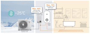 Funcționarea stabilă este garantată chiar și la temperaturi exterioare de -25℃, satisfăcând cerințele de încălzire în zone extrem de reci. Poate produce apă caldă până la 60℃ la ieșirea din unitatea interioară. Pentru apă caldă menajeră, intervalul de funcționare se extinde până la 40℃, iar apa din rezervor poate ajunge la maximum 75℃ cu ajutorul încălzitorului electric, asigurând sterilizare eficientă.