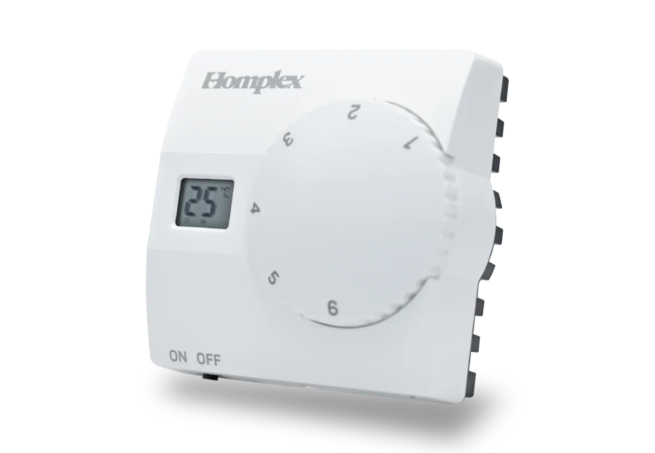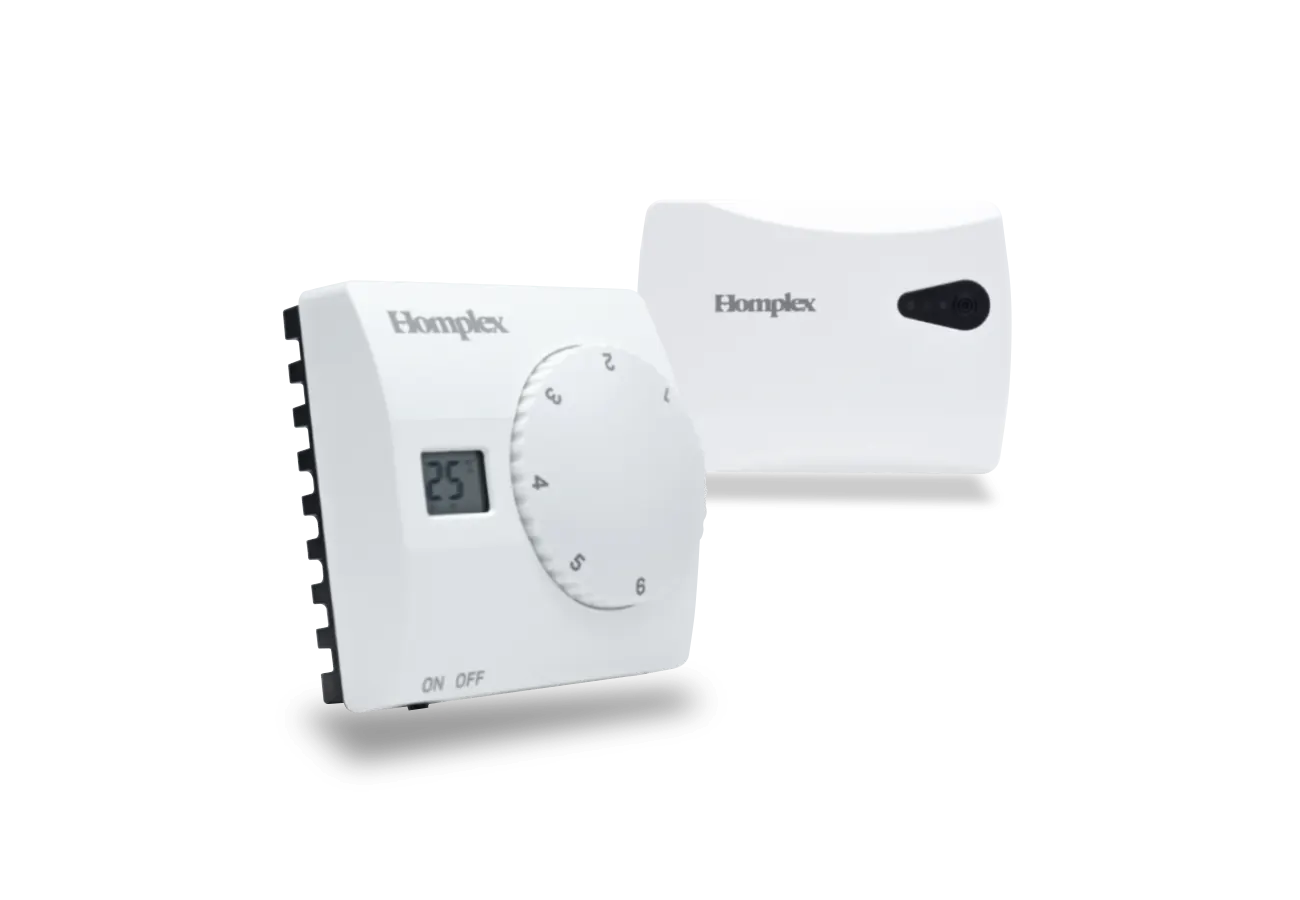Homplex 816 RF este un termostat ambiental neprogramabil simplu de utilizat, fără fir (termostat wireless). Acesta are un buton rotativ de mari dimensiuni pentru controlul temperaturii și un ecran LCD ce va arăta pe rând, temperatura ambientală sau noua temperatură setată.
