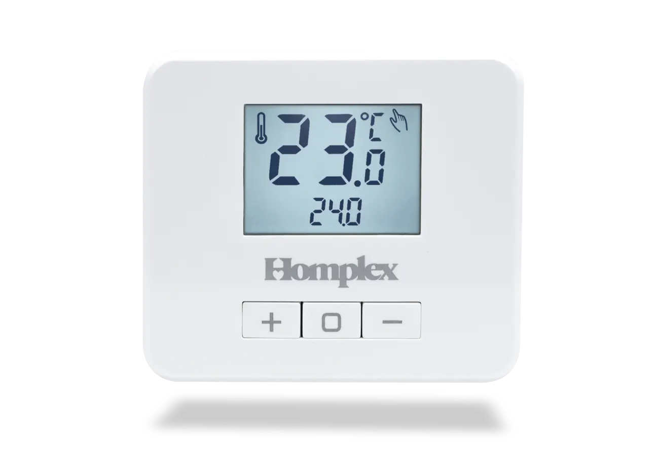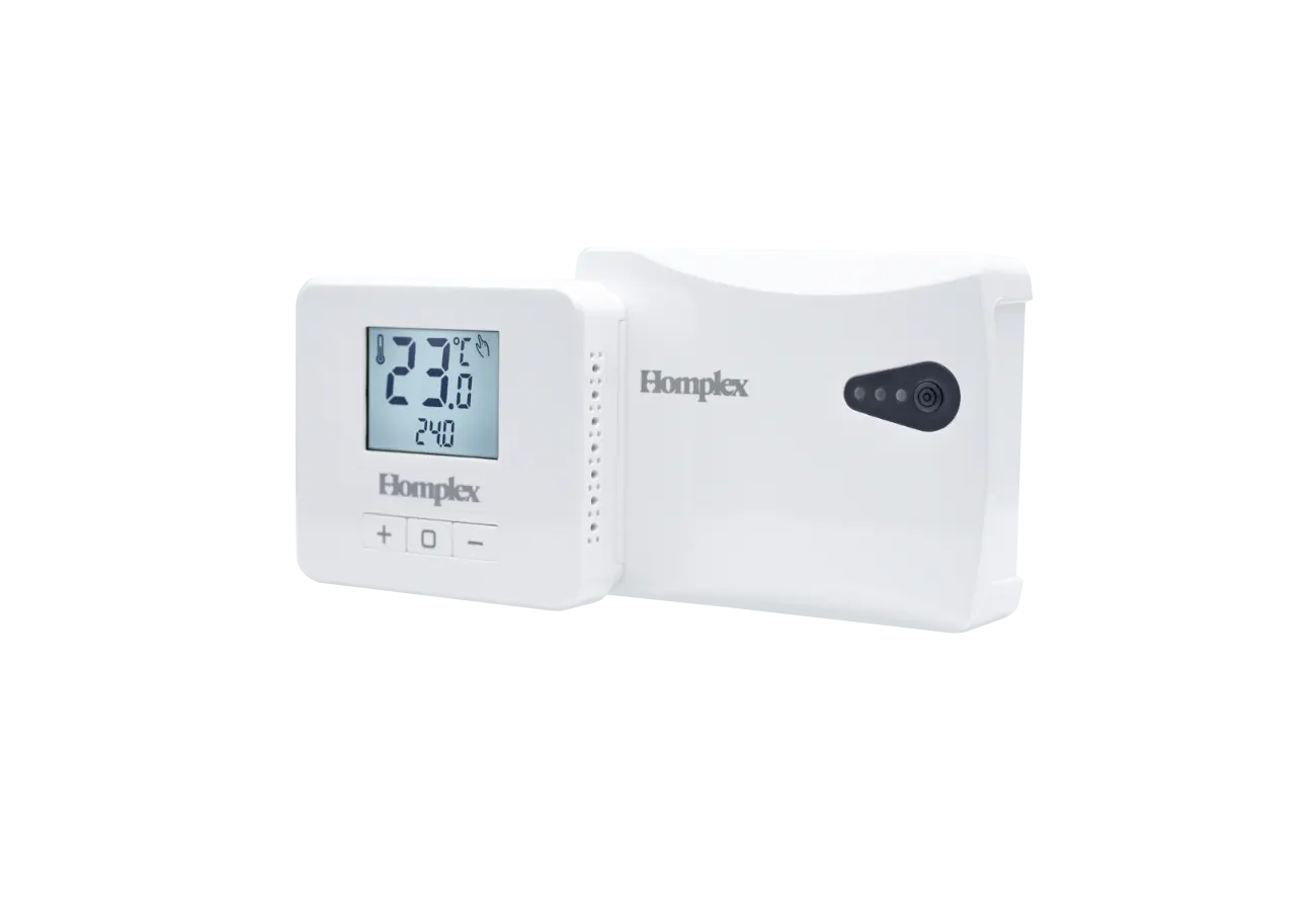 Termostatul neprogramabil Homplex EVO X RF poate funcționa împreună cu centrala termică sau cu instalația de încălzire în pardoseală (electrică). Acesta poate fi poziționat oriunde în locuință datorită comunicării prin radiofrecvență cu receptorul inclus în pachet.