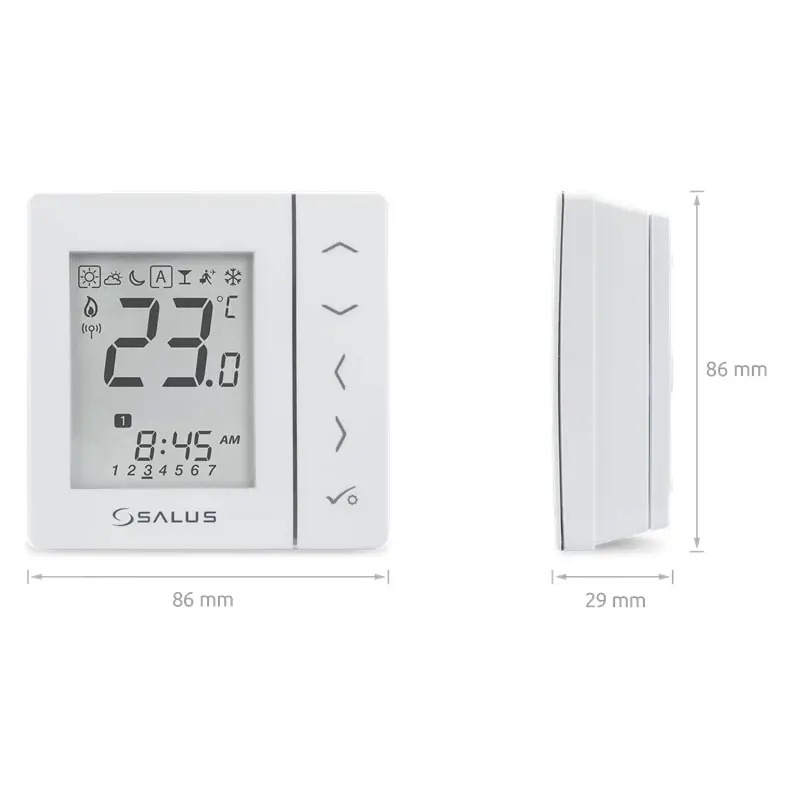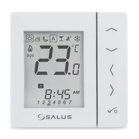 Termostat smart Salus VS20WRF este un dispozitiv wireless, programabil, care poate fi utilizat pentru a controla incalzirea in pardoseala dar si TRV10RFM . Termostatul are un afisaj digital si este alimentat cu baterii 4 x AAA de 1.5 V.